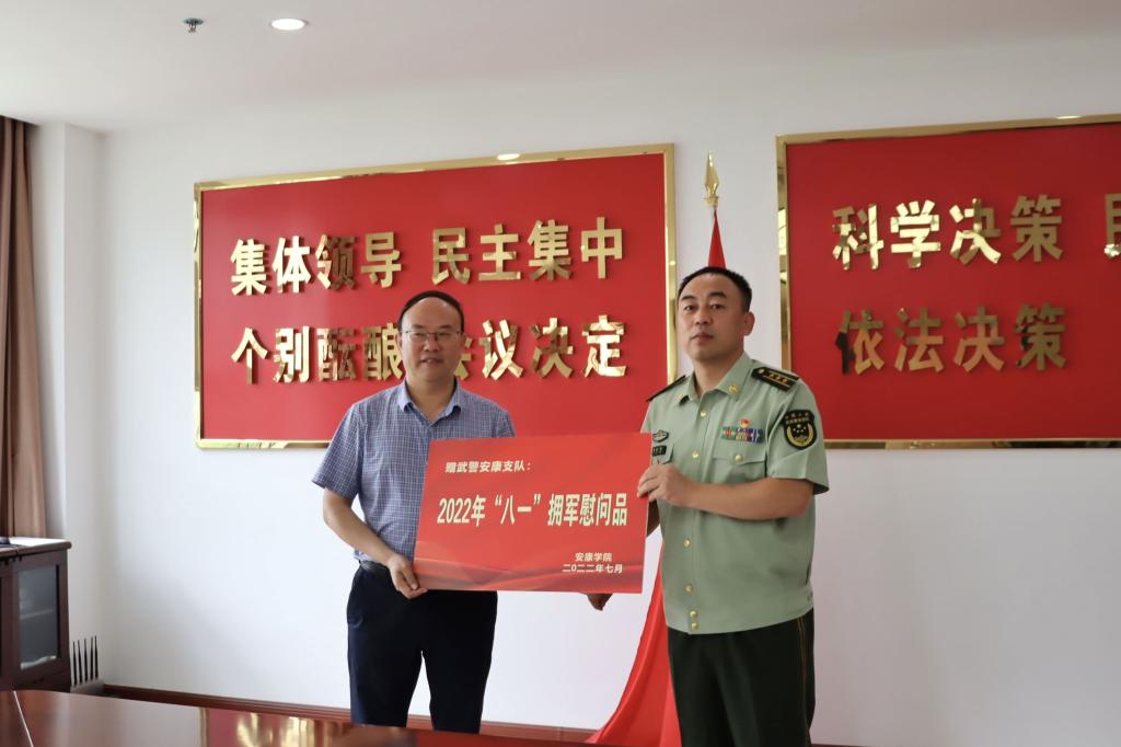 7月27日上午,在建軍節來臨之際,學校黨委副書記楊行玉帶領學工部(武裝部)負責人等前往武警安康支隊,開展“八一”建軍節慰問活動。武警安康支隊支隊長訾進前,副支隊長張建軍等領導接待了楊行玉一行并共同召開了座談會。