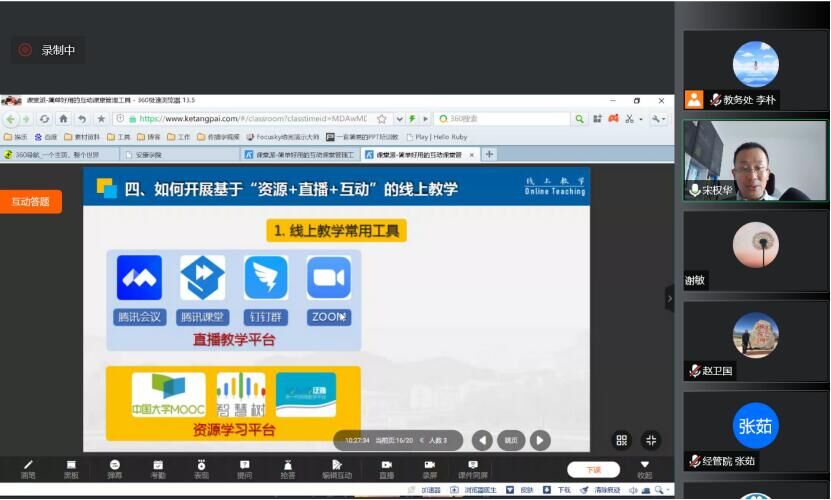 培訓會邀請我校電子與信息工程學院宋權華副教授做《線上教學的工具、策略與組織方法》專題講座,分别從線上教學的背景、現狀和問題、線上教學的組織策略以及如何開展基于“資源+直播+互動”的線上教學等方面進行分享與互動交流。參訓教師紛紛表示,本次培訓内容充實且實用性強,對有效開展線上教學起到了積極的促進作用。
